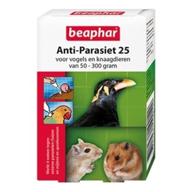 The Beaphar Anti-Parasite Rodent/Bird 25 is an insecticide against lice, mites, and roundworms for birds and rodents weighing between 50 and 300 grams. This insecticide for birds and rodents weighing between 50 and 300 grams offers protection against internal and external parasites such as lice, mites, and roundworms. The product comes in convenient squeeze pipettes, which prevent overdosing. The anti-parasite is absorbed through the skin and provides four weeks of protection.