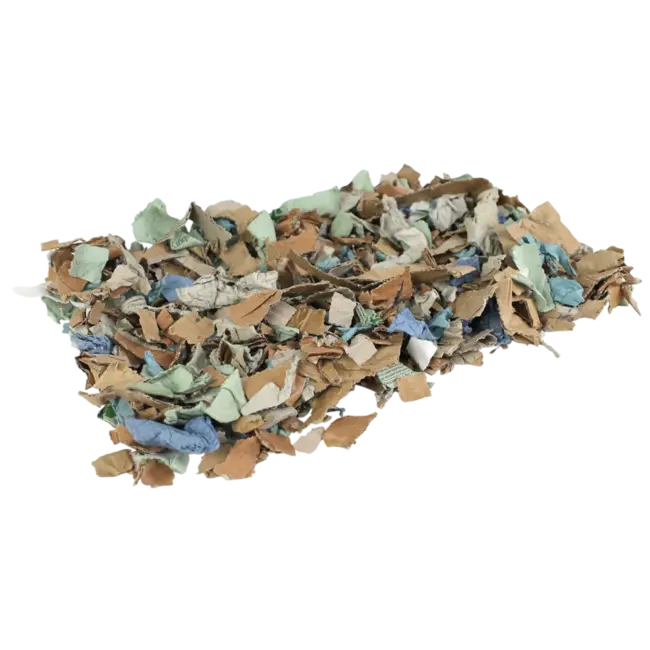 A healthy, eco-friendly, and alternative bedding solution. It consists of a mix of shredded brown cardboard and egg cartons. This mix creates a loose product, allowing waste to sink to the bottom while keeping the surface clean and dry for a long time.