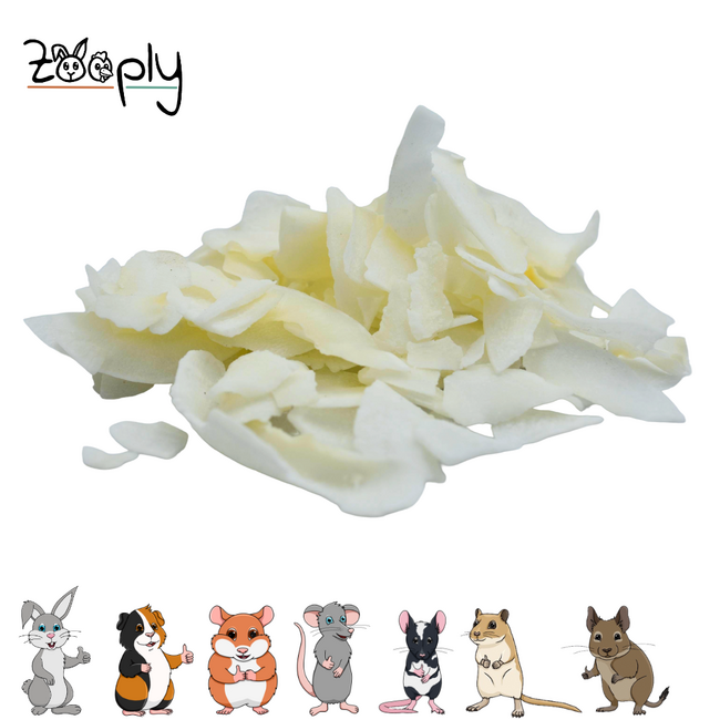 Zooply coconut is a tasty, dried snack for rabbits and rodents. The coconut pieces have a pleasant aroma and a firm bite. This makes it a fun alternative to hay and daily food, without unnecessary additives.