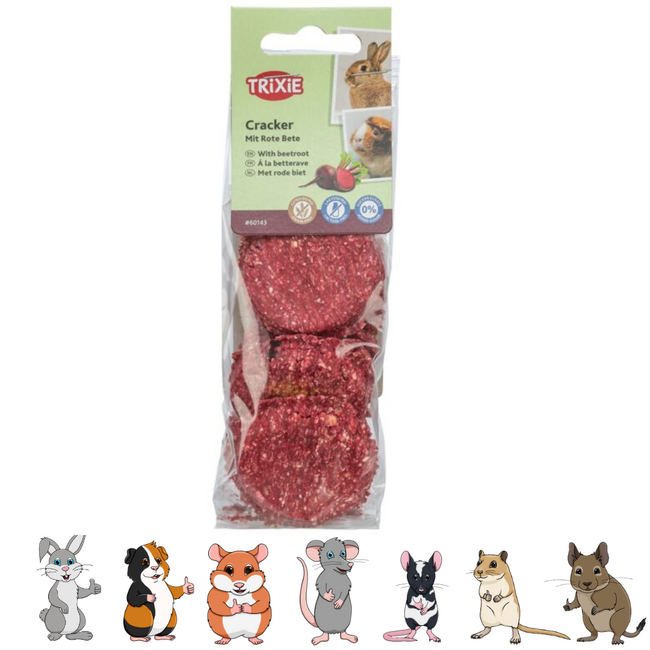 The crackers are tasty snacks, specially developed for your rodents such as guinea pigs, rabbits, and hamsters. This treat offers a delightful way to pamper your pets with the flavor of beetroot.