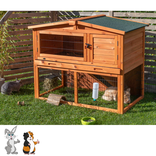 The rabbit hutch measuring 124 × 102 × 78 cm is the ideal outdoor residence for your rabbits. This spacious hutch not only provides your pets with a safe place to shelter but also ample room to move freely and play. Thanks to its thoughtful design, the hutch is perfectly tailored to the natural needs of rabbits, allowing them to feel both at home and free in their outdoor environment.