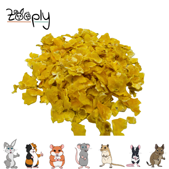 Zooply Dried Corn Flakes are available in multiple weights, so you can choose the right amount for your rabbits and rodents. Make sure that dried corn flakes are a supplementary part of your pets' diet and that they always have access to fresh water, good quality hay, and a balanced diet tailored to their specific needs.