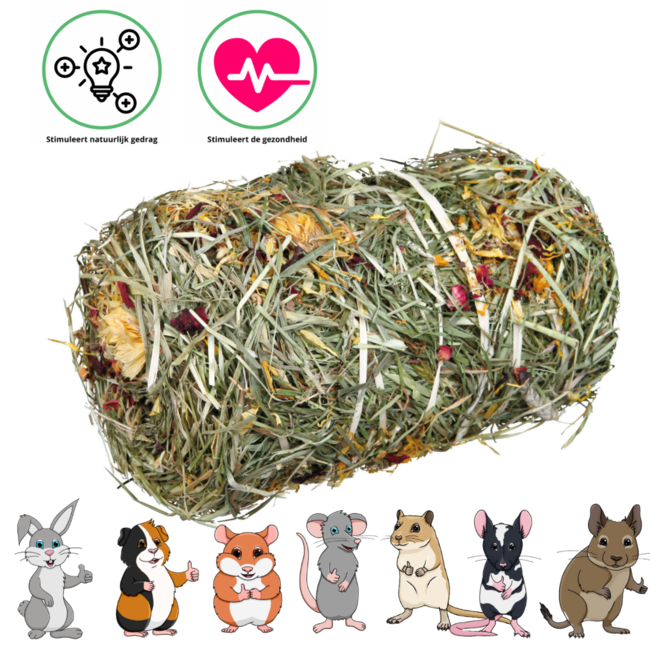 - Made from hay with a tasty blossom mix, wrapped in hemp rope