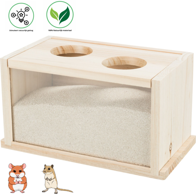 The Trixie Sandbath for Mice / Hamsters Wood 20 x 12 x 12 cm is a wooden box with a plexiglass panel, two entrances for hamsters, mice, and other small rodents. These animals like to clean themselves with a sandbath, which contributes to a healthy skin and good nail and body care. This bath is a wooden box with a plexiglass panel on the front, so you can observe your animals while they take a bath. The lid keeps the sand inside and has two entrances, allowing the animals to safely enter and exit when they are in groups.