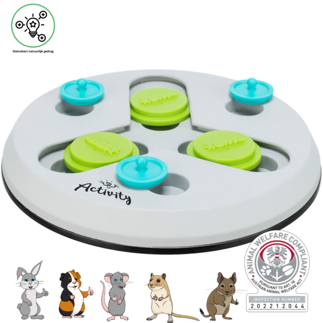 The Trixie Slide & Fun Board Plastic, measuring 23 x 23 cm, is an intelligence game for rodents. It is a board game with various sliders and lids to hide rewards. Challenge your small pet with this Slide & Fun Board from Trixie! This intelligence game provides mental stimulation by allowing your pet to open and search for its reward in the different lids and bowls. Searching for food is a natural activity for your pet, which helps prevent boredom and stimulates its instincts. This board game is non-slip thanks to its rubber ring and comes with a training manual. Made of plastic and dishwasher-safe.