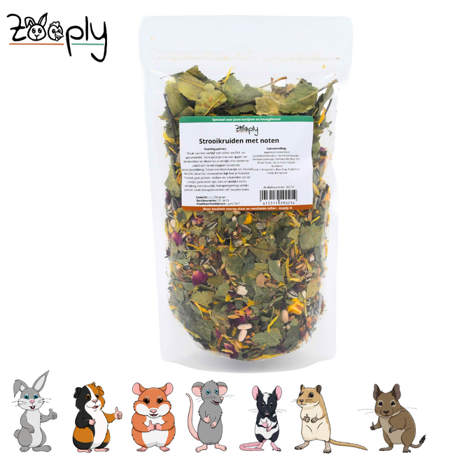 Transform the habitat into a true sniffing and searching world with Zooply Foraging Herbs with Seeds for rodents. This fragrant forage mix consists of apple and birch leaves and flowers, and is filled with various seeds. The mix is also enriched with an extra tasty addition, such as nuts. This way, you provide your hamster, mouse, rat, gerbil, or other small rodent with a delicious enrichment that fits their natural foraging behavior.