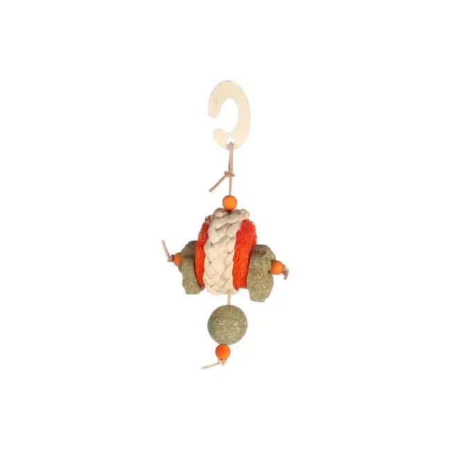 This nibbling toy is made of natural materials such as hay, loofah, corn leaves, leather, and wood. Perfect for nibbling on and beneficial for dental health. Easily hang it up with the wooden hanging hook.