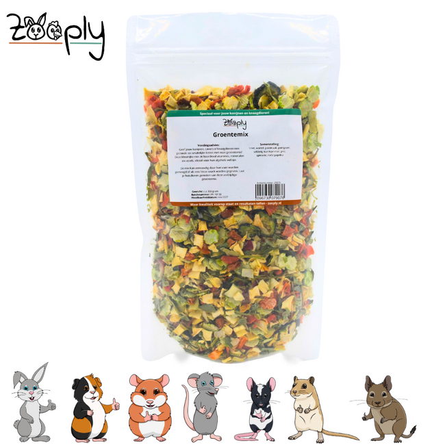 Zooply Vegetable Mix is the perfect, healthy snack to pamper your rabbits, guinea pigs, and other rodents. This colorful mix of carefully selected dried vegetables not only offers an irresistible taste experience but also provides a valuable addition to their daily diet. With ingredients like carrot, parsnip, pea flakes, pumpkin, celeriac, cucumber, leek, spinach, and bell pepper, you give your pets the natural variety they deserve. The result? Happy animals with a balanced diet!