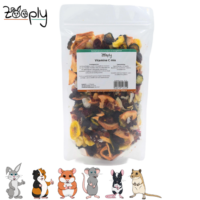 Zooply Vitamin C Mix is a delicious and nutritious combination specially formulated to support the health and well-being of your rabbits, guinea pigs, and other rodents. This carefully selected mix contains red bell pepper, rose hips, rowan berries, apple cubes, banana pieces, and cucumber. With these ingredients, the mix not only offers a delightful taste experience but also a rich source of vitamin C, essential for a strong immune system.