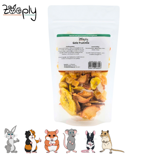 Best of all? Zooply Yellow Fruit Mix is 100% natural and free from artificial additives. The dried fruit pieces are carefully processed to retain all nutrients, making this a safe and responsible snack for daily use. Whether you want to reward your rabbit with a piece of mango or pamper your guinea pig with some pineapple, this fruit mix is suitable for any occasion.