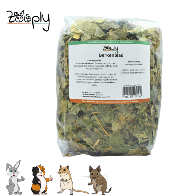 The benefits of adding birch leaf to your pet's diet are numerous. It supports a healthy coat, promotes a well-functioning immune system, and contributes to the overall vitality and well-being of your pet. Whether it's rabbits, guinea pigs, mice, degus, hamsters, or even chickens, Zooply Birch Leaf is suitable for a wide range of animals.