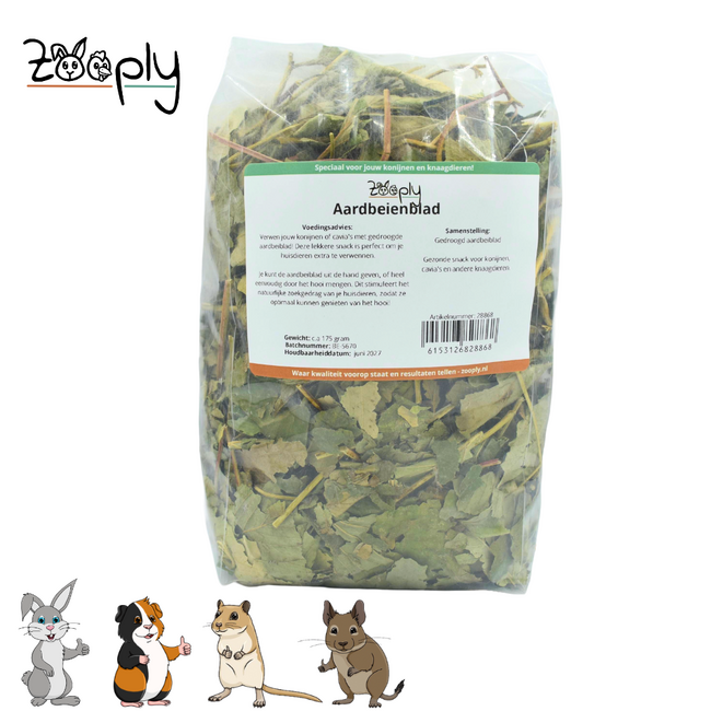 De bladeren zijn licht en knapperig, waardoor je ze makkelijk kunt geven als kleine traktatie of als afwisseling in het verblijf. Zooply aardbeiblad is ook fijn om door het hooi te mengen. Dat maakt het eten interessanter en stimuleert het zoeken en knabbelen, zoals jouw dier dat van nature ook doet. Omdat het om gedroogde bladeren gaat, heb je weinig rommel en kun je de hoeveelheid goed doseren. Geef altijd vers drinkwater en bewaar het product droog en koel om de geur en kwaliteit goed te houden.