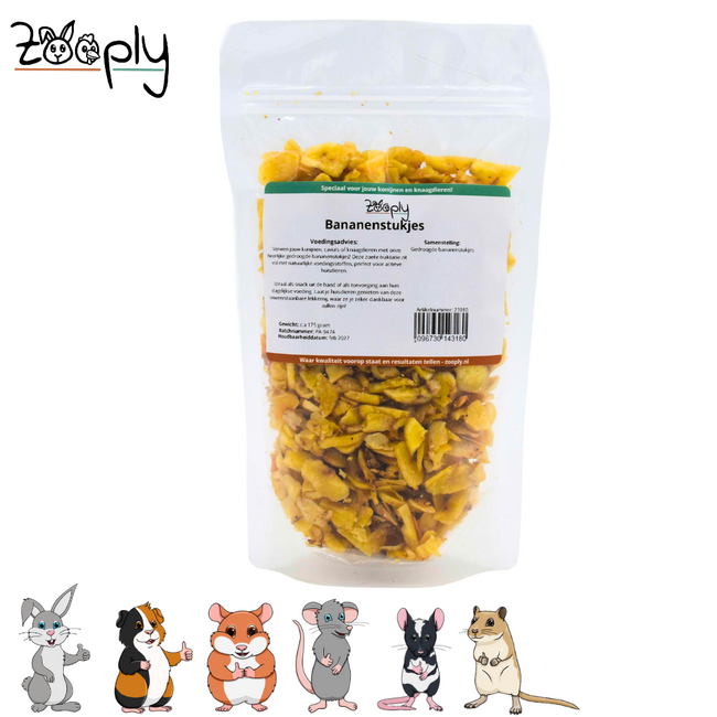 Zooply Bananenstukjes zijn een natuurlijke snack voor konijnen, cavia’s en kleine knaagdieren. Deze smakelijke stukjes banaan zorgen voor extra afwisseling naast het dagelijkse voer en zijn een leuk extraatje voor tussendoor. Door de zoete geur, zachte bite en herkenbare smaak zijn bananenstukjes voor veel kleine huisdieren een aantrekkelijke traktatie.