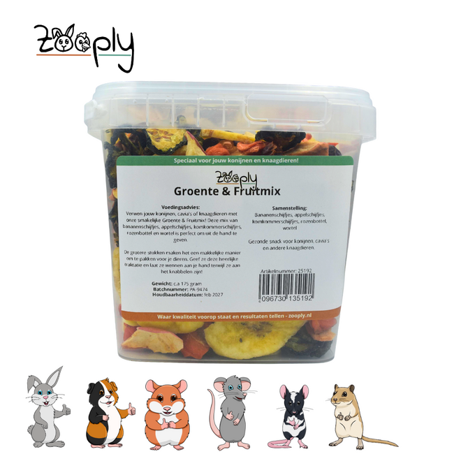 Zooply Groente & Fruit Mix is een onweerstaanbare combinatie van gedroogde lekkernijen die perfect aansluit bij de behoeften van je konijnen, cavia’s en andere knaagdieren. Met zorgvuldig geselecteerde ingrediënten zoals appelschijfjes, wortelschijfjes, bananenschijfjes, rozenbottel en komkommer, biedt deze mix niet alleen een heerlijke smaakervaring, maar ook talloze gezondheidsvoordelen. Wil je je huisdier verwennen én een stapje dichterbij komen? Deze mix is ideaal om een vertrouwensband op te bouwen en tamheid te bevorderen.