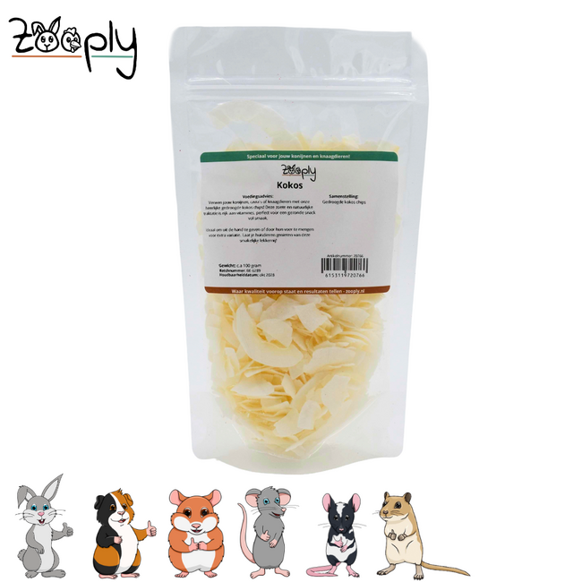 Zooply kokos is een lekkere, gedroogde snack voor konijnen en knaagdieren. De kokosstukjes hebben een fijne geur en een stevige bite. Dit maakt het een leuke afwisseling naast hooi en de dagelijkse voeding, zonder onnodige toevoegingen.