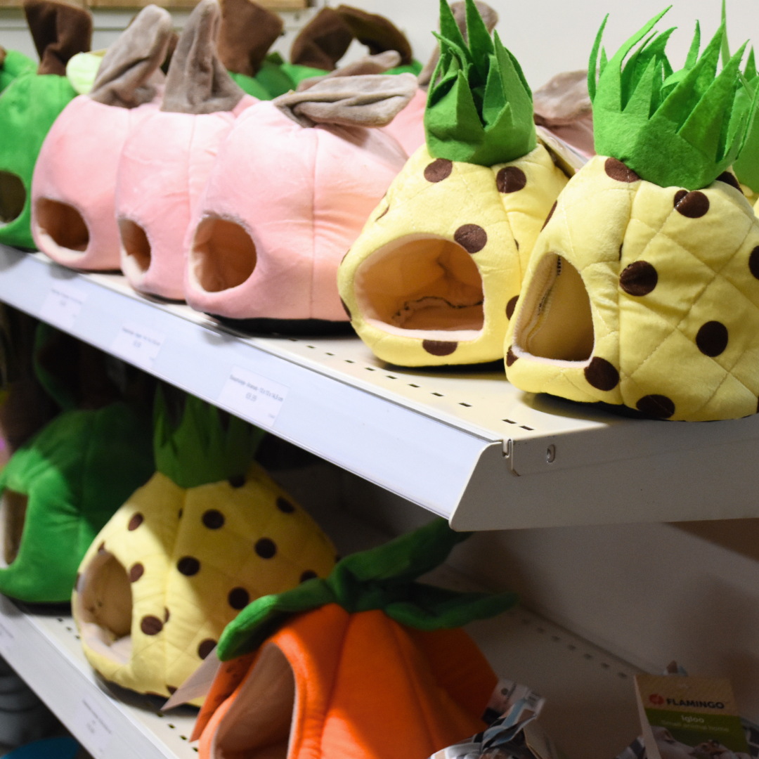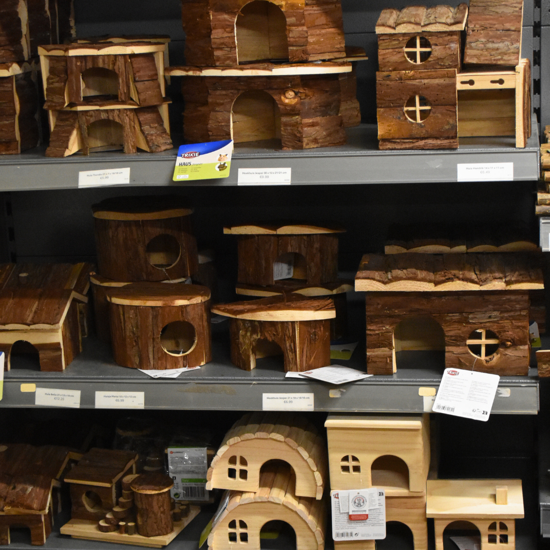 Waterflesjes, voerbakjes, hooiruiven, tunnels, huisjes en speelgoed voor cavia’s. Alles aanwezig in de winkel.