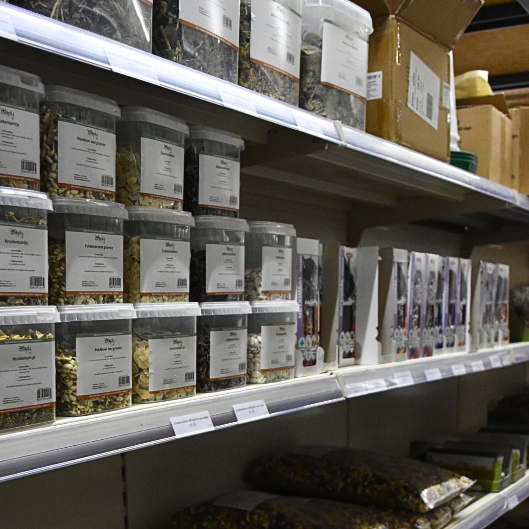 Een apart deel van onze winkel is gewijd aan Zooply — ons eigen merk voor konijnen- en knaagdierproducten. Zooply is ontstaan vanuit onze eigen behoefte: als dierspeciaalzaak gebruikten wij dagelijks producten voor onze eigen dieren en merkten wij dat het beschikbare aanbod op de markt niet altijd aansloot bij wat wij zochten. Te veel granen in voeding, onvoldoende variatie in bodembedekking, gedroogde kruiden die moeilijk los te kopen waren.