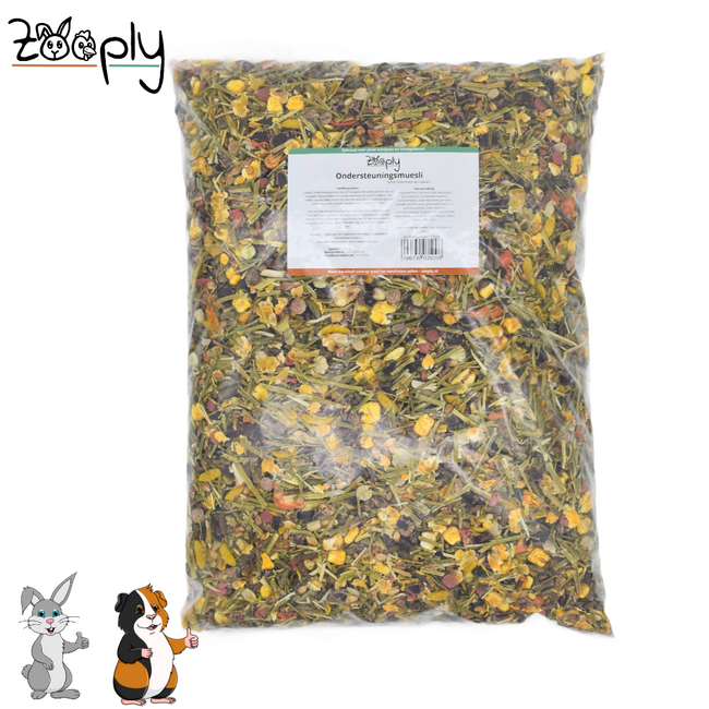 De unieke samenstelling van Zooply Ondersteuningsmuesli biedt tal van voordelen. Het ondersteunt de spijsvertering op een natuurlijke manier dankzij het hoge vezelgehalte, wat cruciaal is voor de gezondheid van de darmen. Omdat het product niet vult maar wel veel gegeten kan worden, blijven de darmen van jouw konijnen en cavia's actief, zoals nodig is om hun spijsverteringssysteem optimaal te laten functioneren. Dit maakt de muesli bijzonder praktisch en efficiënt in gebruik.